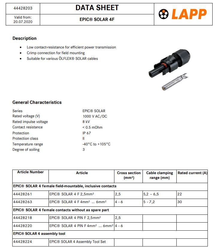 1000V EPIC SOLAR 4M 4mm² (Female), 4 mm connector system with double hook, inclusive contacts, OD of cable 5.2-7.1mm - (Canada) - Lapp