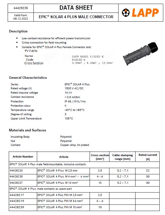 1500V EPIC SOLAR 4Plus 4mm2 Low contact- (Male), 4 mm connector system with double hook, inclusive contacts, OD of cable 5.2-7.1mm - (Europe) - Lapp