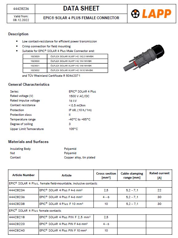 1500V EPIC SOLAR 4Plus 4mm2 Low contact- (Female), 4 mm connector system with double hook, inclusive contacts, OD of cable 5.2-7.1mm - (Europe) - Lapp